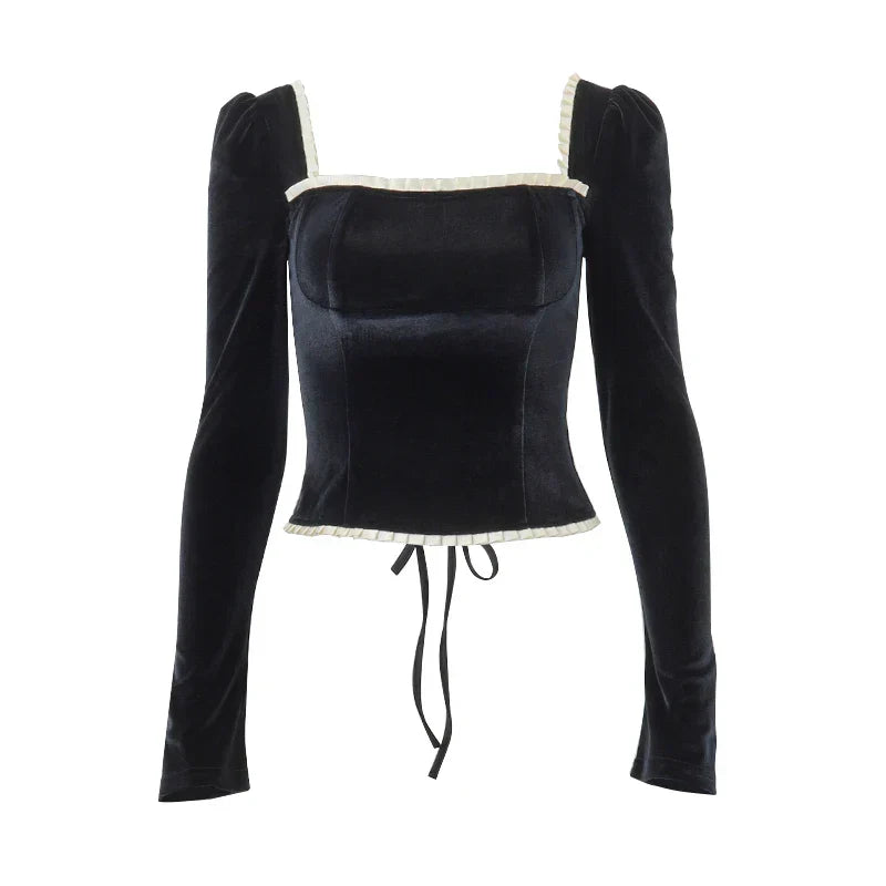 Le Ismene Velours Longue Manchon Haut est un mélange luxueux de textures douces et de détails délicats, conçu pour la femme qui aime se démarquer avec une élégance subtile. Son tissu en velours riche et ses empiècements en dentelle complexes allient le dramatique et le féminin de la manière la plus naturelle qui soit.